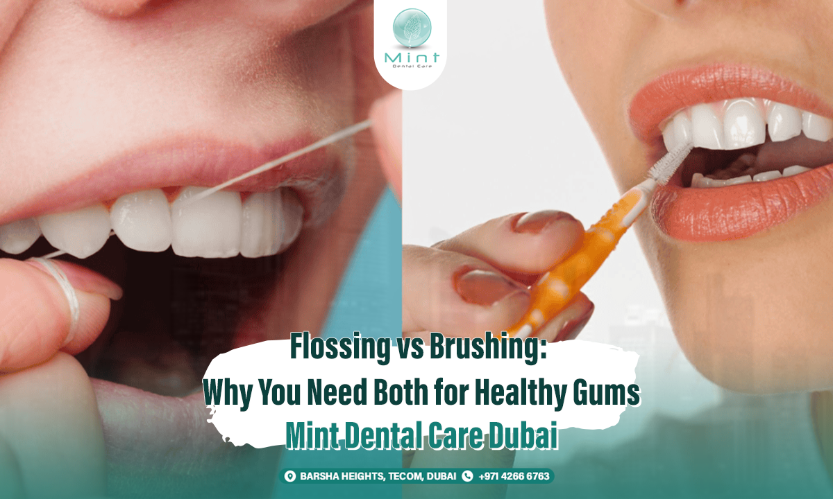 Flossing vs brushing: learn why you need both for healthy gums, how each one works, and how to prevent plaque buildup and early gum disease with Mint Dental Care in Dubai.